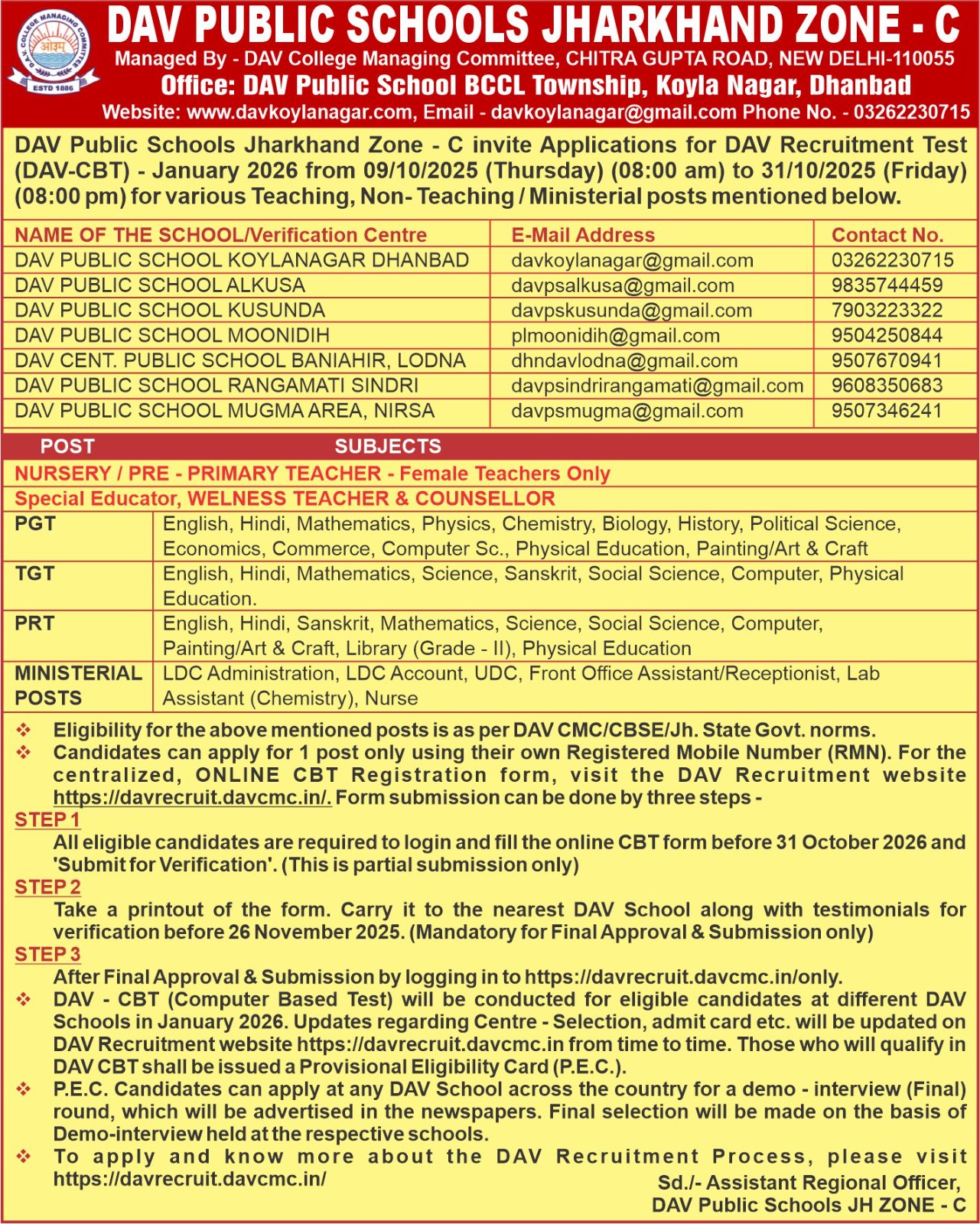 D.A.V. Public Schools Jharkhand Zone C invites Online Applications for DAV Recruitment Test (DAV-CBT) January 2026 for various Teaching, Non-Teaching /Ministerial posts. click on Download to find notification.
